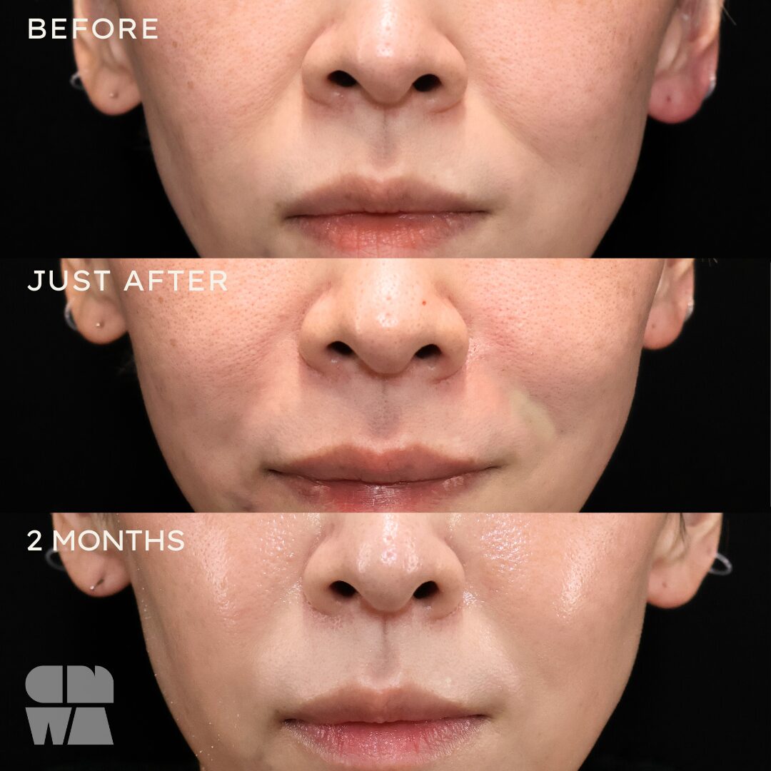 ダウンタイム施術後は内出血や赤みが出ることがありますが、1~2週間程で引いていきます。完全に落ち着くまでには通常1~2か月程かかることがあります。