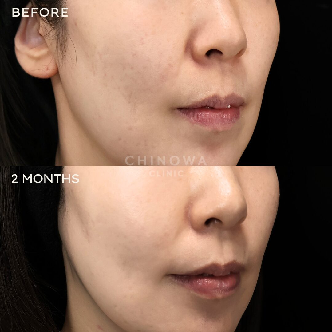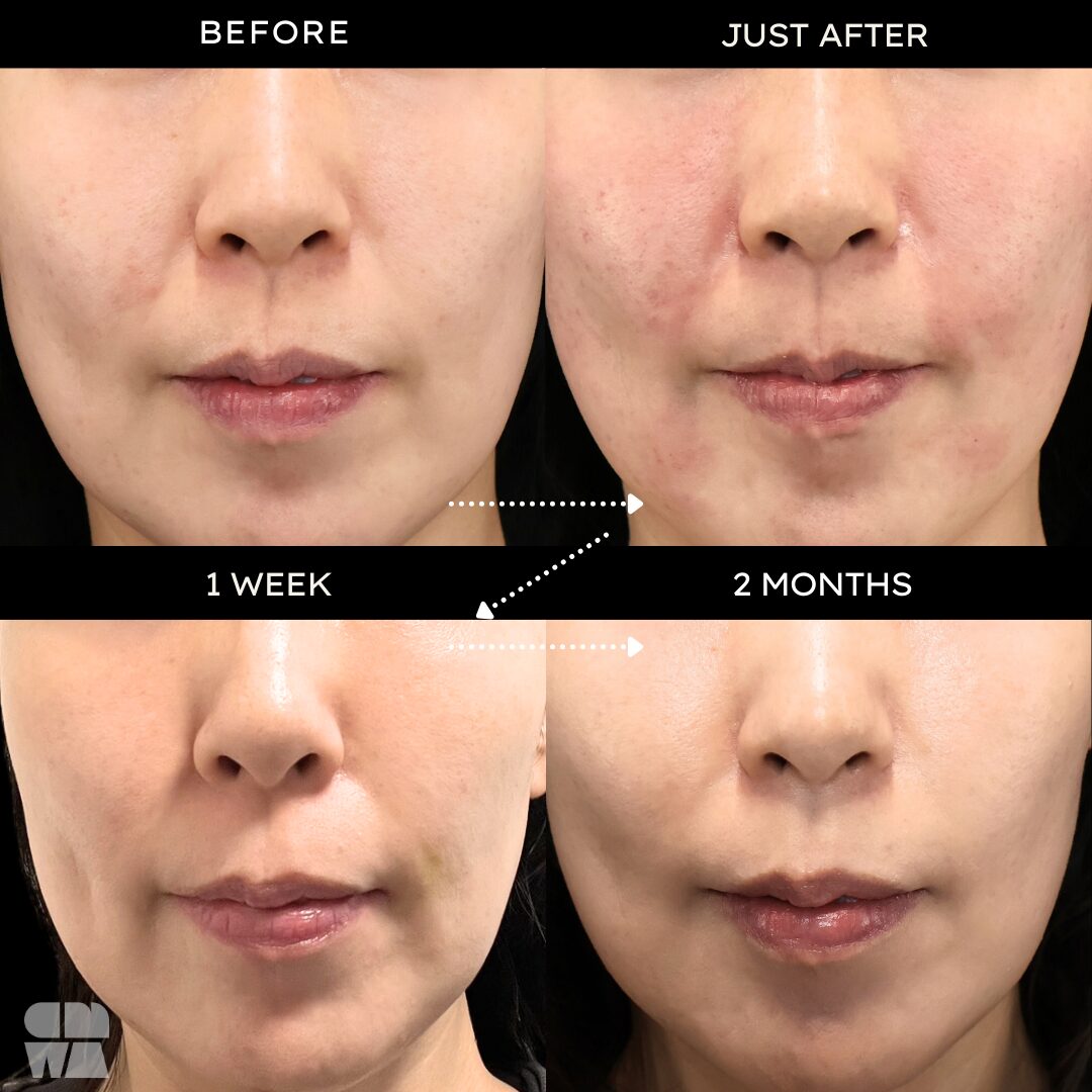 ダウンタイム施術後は内出血や赤みが出ることがありますが、1~2週間程で引いていきます。完全に落ち着くまでには通常1~2か月程かかることがあります。