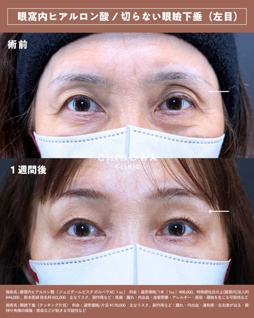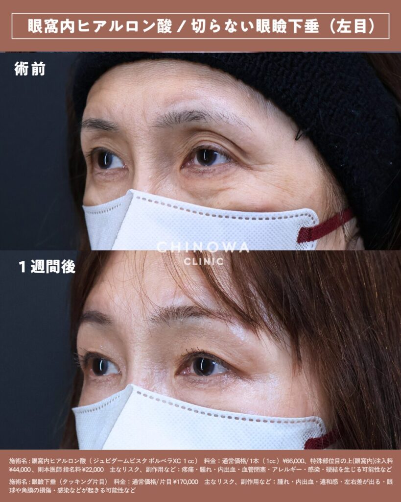目の裏側から糸で支えて開きをサポートし、ヒアルロン酸で眼窩脂肪をふっくら底上げし、施術直後から「目の開きが軽くなった」「若返った」と実感される方が多い満足度の高い治療です。