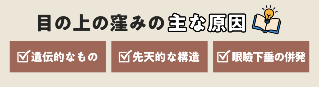 まず、まぶたのくぼみは「加齢」だけが原因ではありません。実は、もともとの骨格的要因や、眼瞼下垂(がんけんかすい)といった機能的な問題も関係しています。