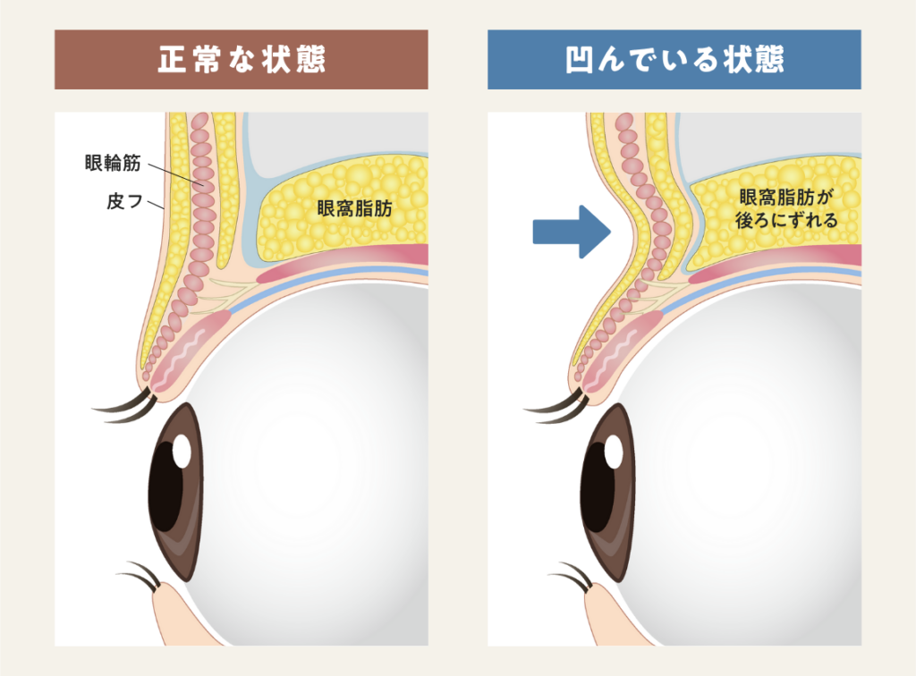 また、眼瞼下垂を併発している場合は、目の開きが悪いために眉毛を使って目を開けようとするクセがつきます。その結果、眼窩脂肪(がんかしぼう)が後ろにずれてしまい、余計にくぼみが進行してしまいます。
