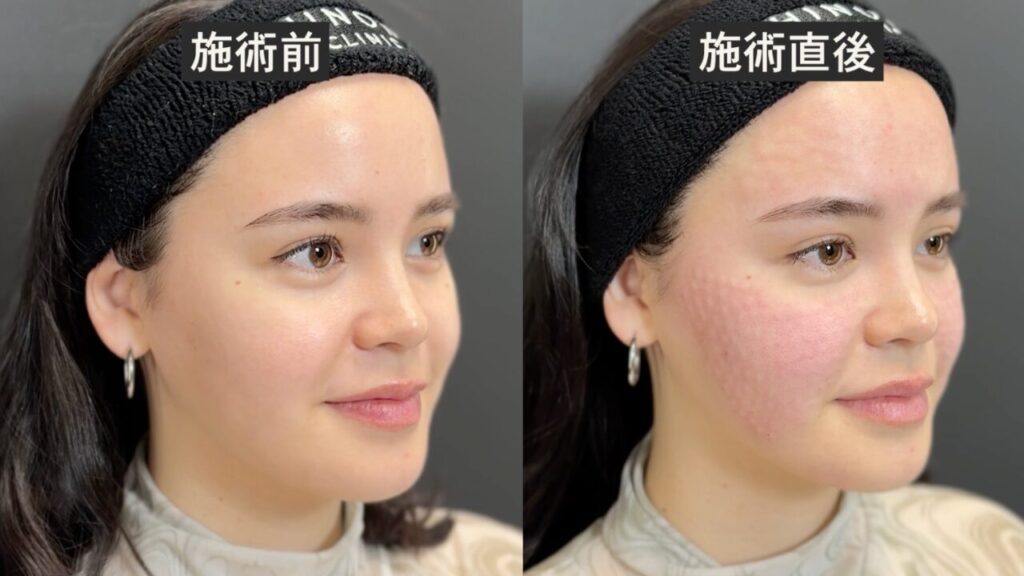 【施術直後〜翌日】 針を刺した部分に小さなプツプツ感がありますが、マスクをすれば外出も問題なし。翌朝は若干の赤みが残る場合もありますが、翌日の夕方にはほぼ気にならなくなったとのこと。3日目以降は赤みなどが消失し、そこから日を追うごとに効果を感じ始めたそうです。