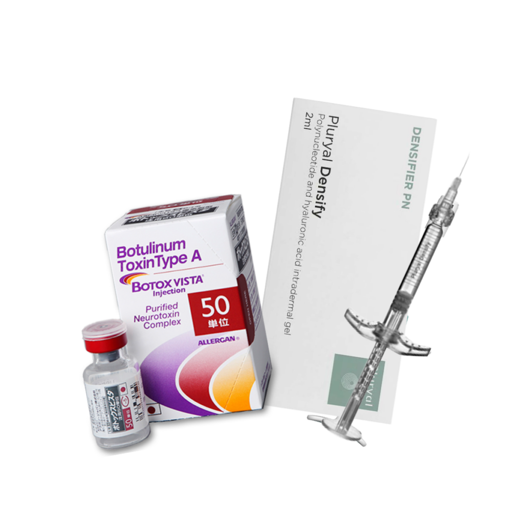 プルリアルデンシファイは、ポリヌクレオチドに非架橋ヒアルロン酸とマンニトールを加えたCEマーク取得の製剤です。高い保湿力と抗酸化・抗炎症作用を持ち、赤みや乾燥が気になる方に特に向いています。ボトックスとの組み合わせで、透明感のある引き締まった肌へ導きます。