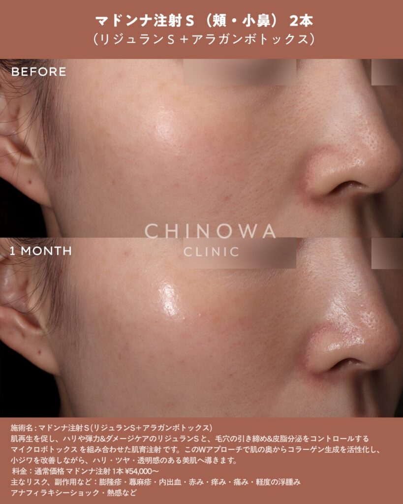リジュランSは、ポリヌクレオチド(PN)を2%配合した、肌再生・修復に特化した製剤。リジュランシリーズの中でも最も自己修復力が高く、ハリ・弾力を引き出しながらクレーターや小ジワをふっくらと改善します。これに微量のボトックスを組み合わせることで、毛穴の引き締めと皮脂コントロールも同時に実現します。