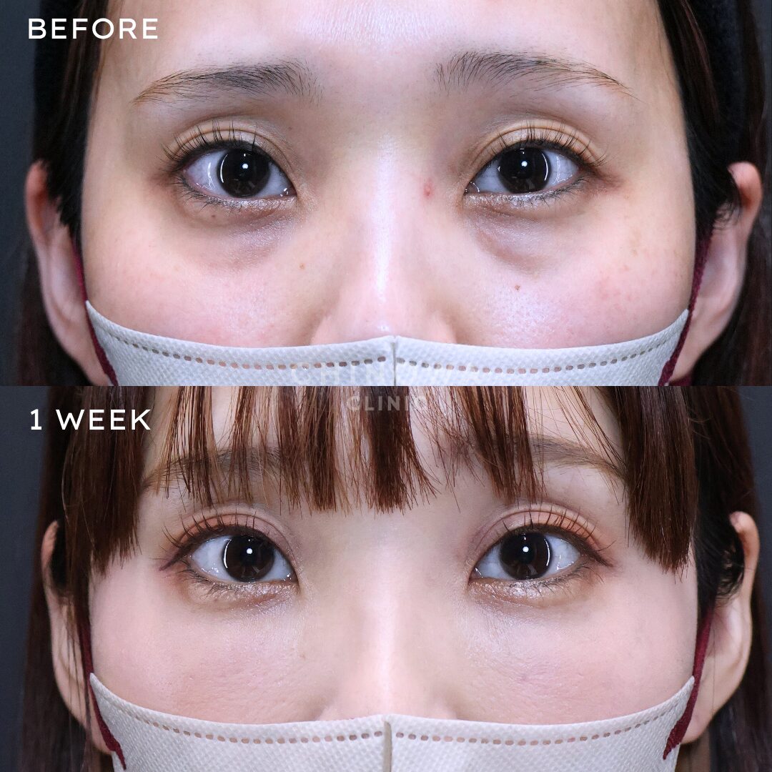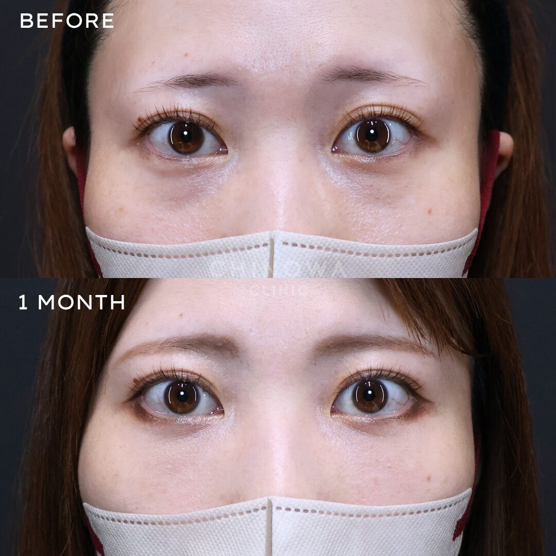膨らんだ眼窩脂肪をその下の窪んだ影の部分(瞼頬溝)に移動させ、余分な皮膚も切除することでふくらみの改善と皮膚の余りを改善できます。皮膚の切開部分は下瞼のまつ毛の下の目立たない箇所になります。