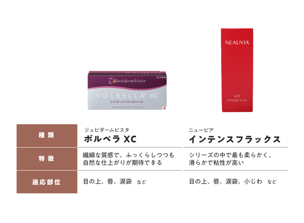 当院では、アメリカFDA(日本の厚生労働省に相当する機関)承認の安全性が高い製剤である「ジュビダームシリーズ(アラガン社製)」と、スイスで開発されたアレルギーリスクの少ないヒアルロン酸「ニュービア」を使用しています。