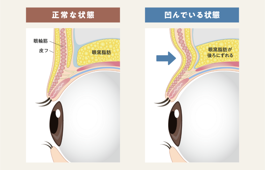 眼の奥の脂肪(眼窩脂肪)が減少すると、上まぶたにくぼみができ、影が目立つようになります。
