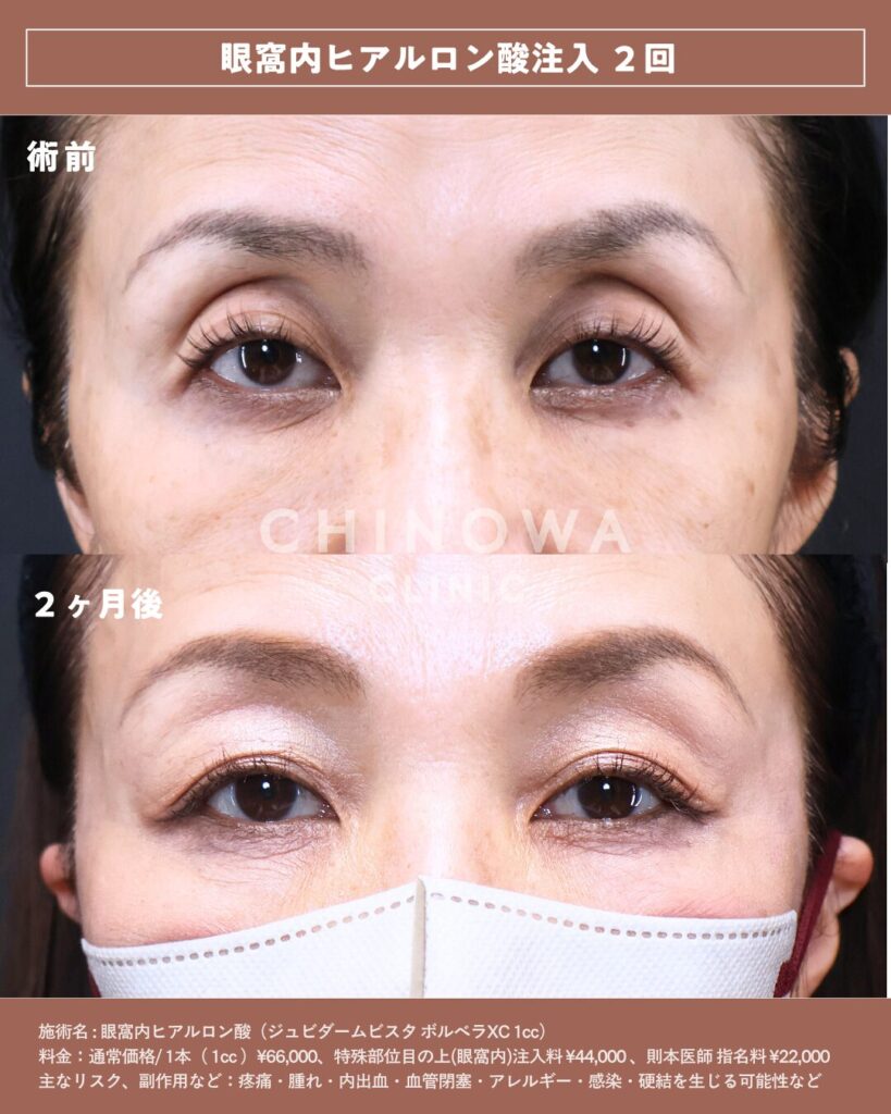 一般的なヒアルロン酸は、6か月〜1年ほどで吸収されますが、眼窩脂肪内は血流が少ない部位のため、ゆっくりと吸収されやすいのが特徴です。