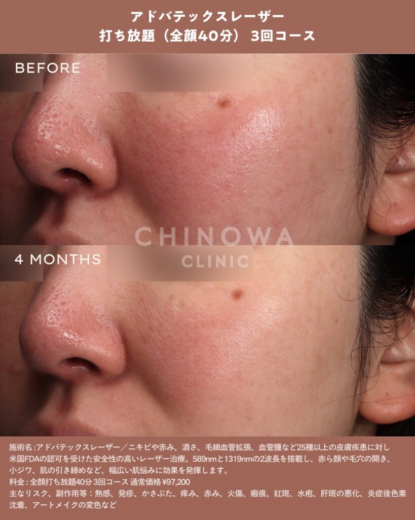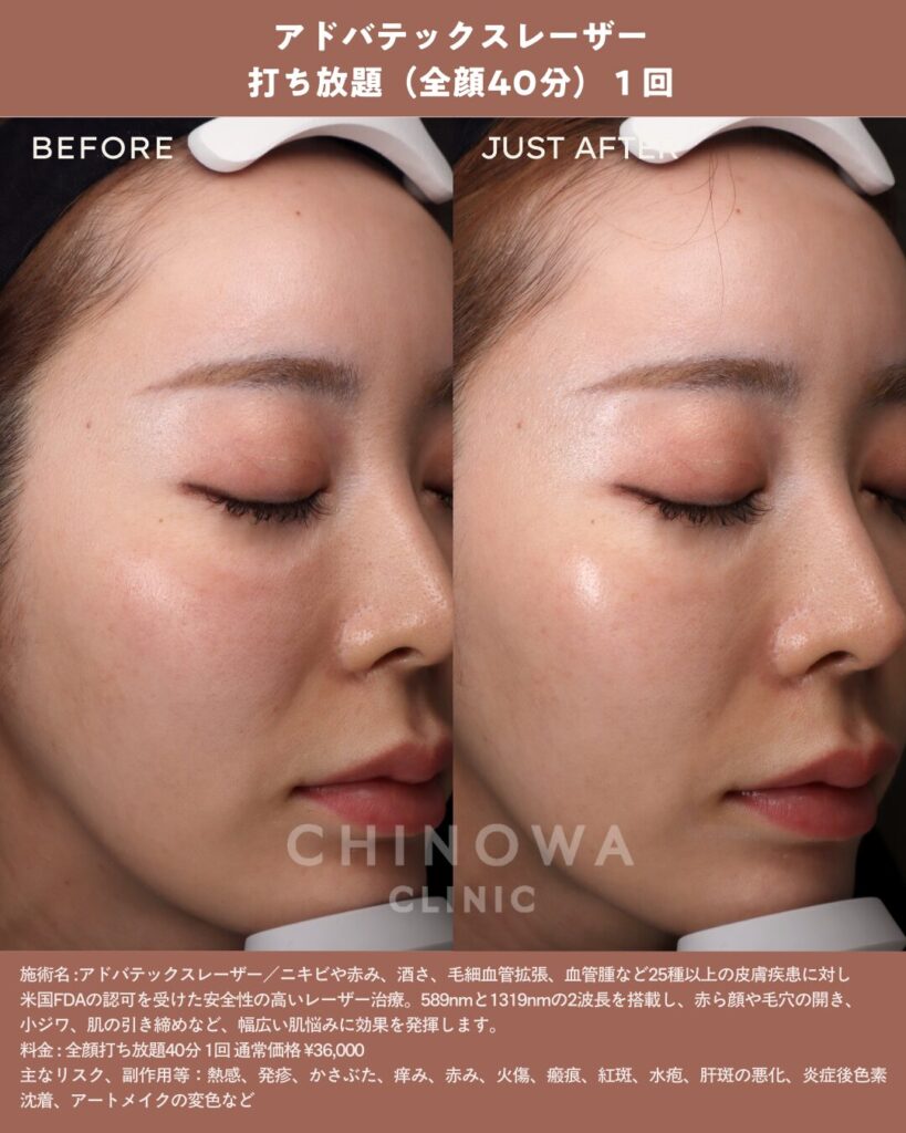 アドバテックスレーザーは、肌への負担を抑えたレーザー治療ですが、施術内容や肌質によっては、一時的な反応が生じることがあります。