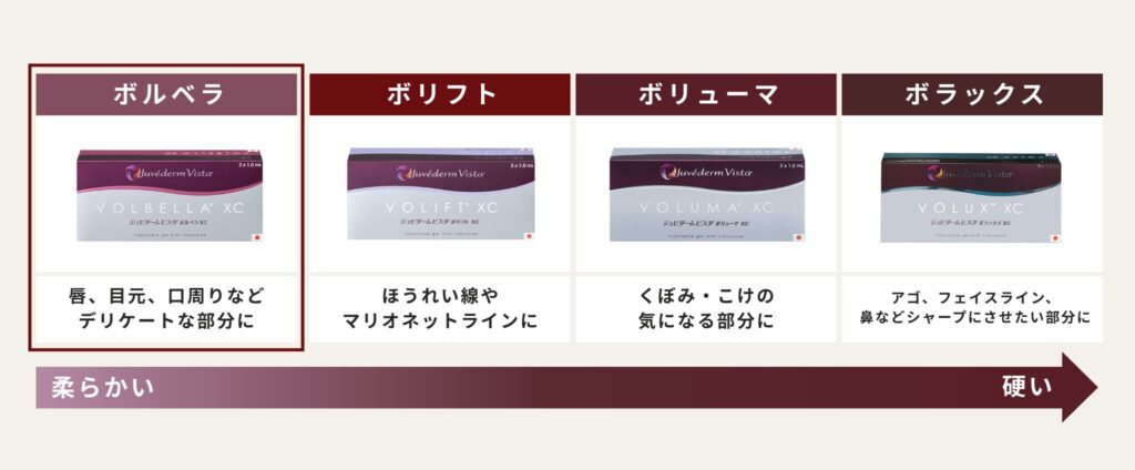 ボルベラは、比較的やわらかいヒアルロン酸製剤となるため、皮膚の薄い唇や下まぶたへの注入がおすすめです。