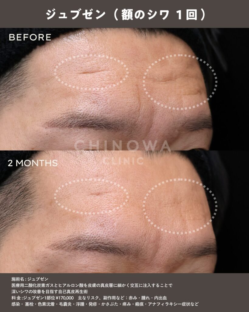 | 注意事項 | ・施術部位にテープを貼った状態でご帰宅いただきますので、施術の当日は深めの帽子やマスクなどをご持参されることをお勧めします。 ・永久的にシワを消失させる施術ではありません。 ・皮膚の弾力が極端に低下している場合、細かいシワが残る可能性があります。 ・コラーゲン組織が多い場合や広範囲の剥離を行った場合、一時的に腫れや膨らみが起こる可能性があります。 ・表情によっては、施術部位の周囲に新たなシワが出ることがあります。 ・皮膚の弾力が極端に低下している場合、細かいシワが残る可能性があります。 ・コラーゲン組織が多い場合や広範囲の剥離を行った場合、一時的に腫れや膨らみが起こる可能性があります。 ・稀に施術部位に色素沈着が起こることがありますが、徐々に改善していきます。(最大半年) ・治療後、皮脂の分泌が一時的に増加することがあります。 ・治療部位が不衛生な状態になると感染のリスクが高まります。 ・アレルギーテストは不要ですが、1%未満の確率でアレルギー反応が出る可能性があります。症状が出た場合にはすぐにご連絡ください。 |
