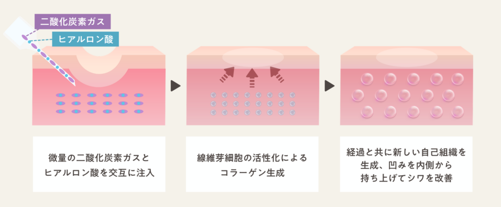 そこにヒアルロン酸を注入し、空間保持をすることで肌再生の土台を作り、新しい皮膚組織の再生を促進します。これにより、シワや凹みが内側から持ち上げられるように改善されます。