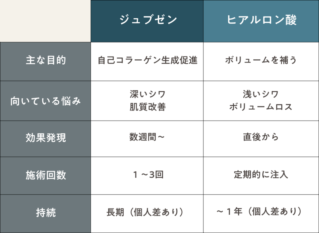 自然なシワ改善や肌質向上を重視するならジュブゼン、即時的なボリューム改善を求めるならヒアルロン酸が適しています。
