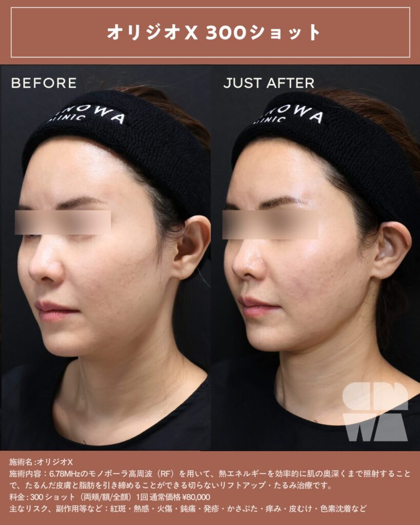 当院では、より高い引き締め効果を求める方に、オリジオX(Oligio X)とハイフ(MPT)のコンビネーション治療「オリハイ」が人気です。異なる層に働きかけることで、深層からのリフトアップ+表層の引き締め・肌質改善を同時に叶えます。