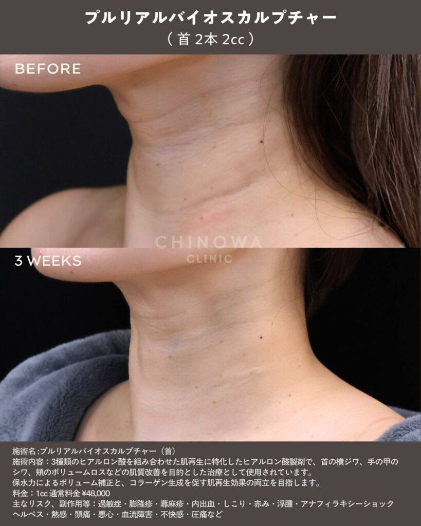 当院では、首の横ジワ治療をはじめ、皮膚が薄く通常のヒアルロン酸注入では凹凸が出やすい部位の治療として、プルリアルバイオスカルプチャーの使用をおすすめしています。