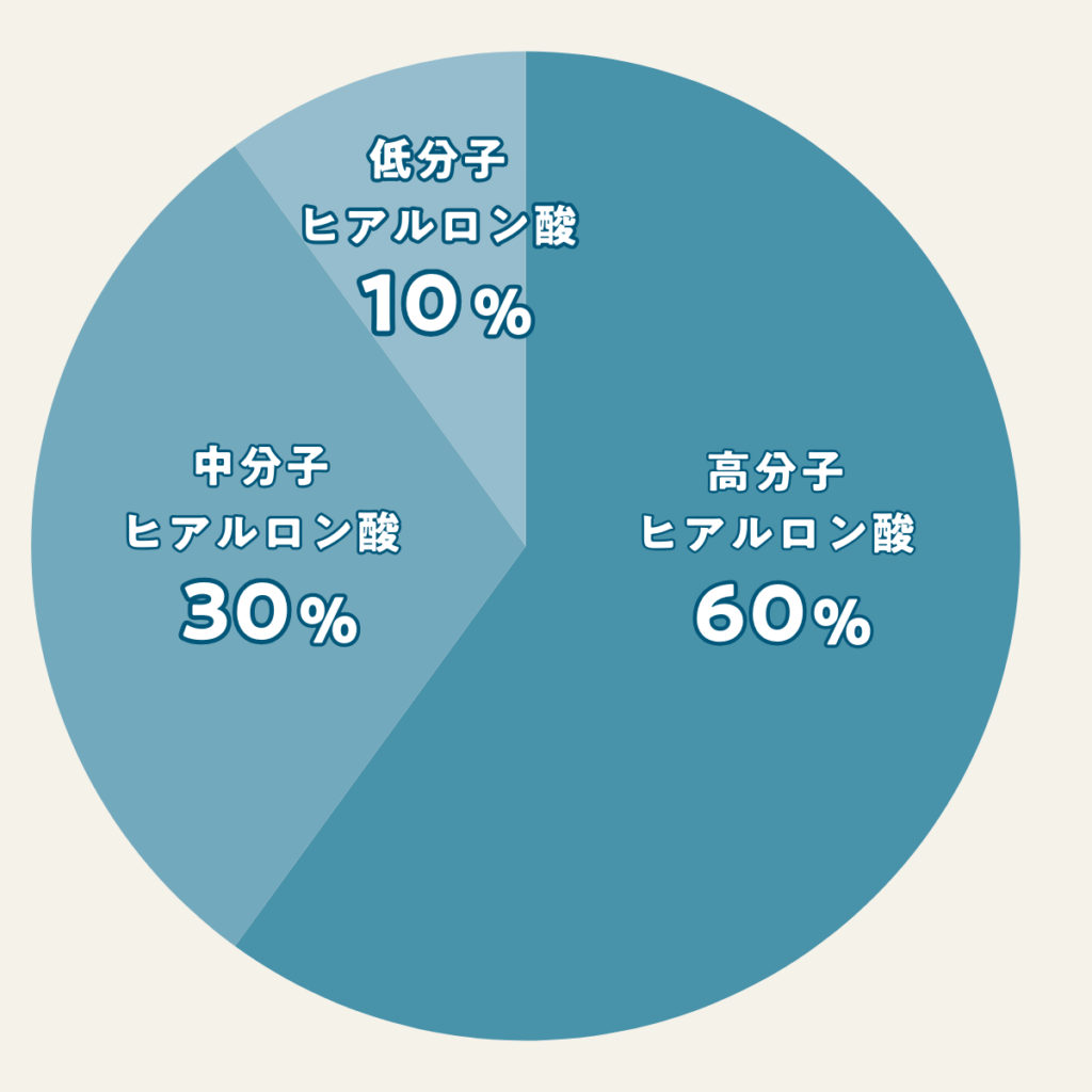高分子・中分子・低分子の異なる分子量のヒアルロン酸を独自のバランス(高分子60%・中分子30%・低分子10%)で配合しており、保水力によるボリューム補正と、コラーゲン生成を促す肌再生効果の両立を目指します。