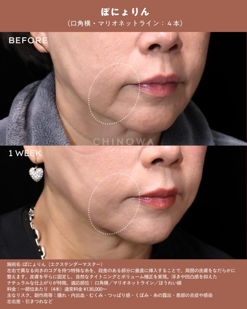 ぽにょりんは、糸の挿入方向・角度・テンションを細かく調整することで、口横やマリオネットラインの段差をなだらかに整える自然なリフトアップを目指します。