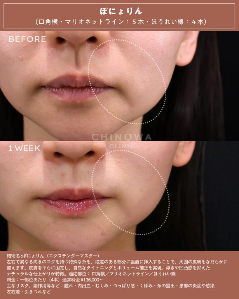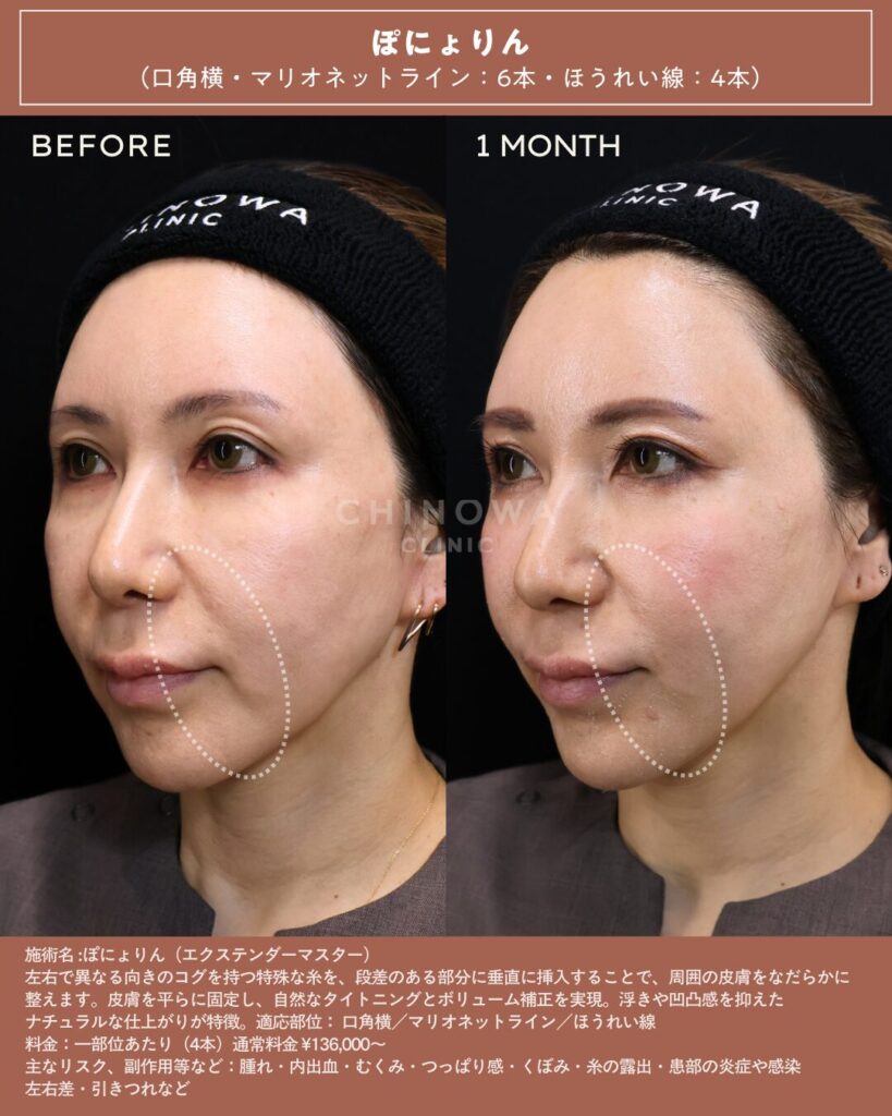 ぽにょりんは、糸の挿入方向・角度・テンションを細かく調整することで、口横やマリオネットラインの段差をなだらかに整える自然なリフトアップを目指します。