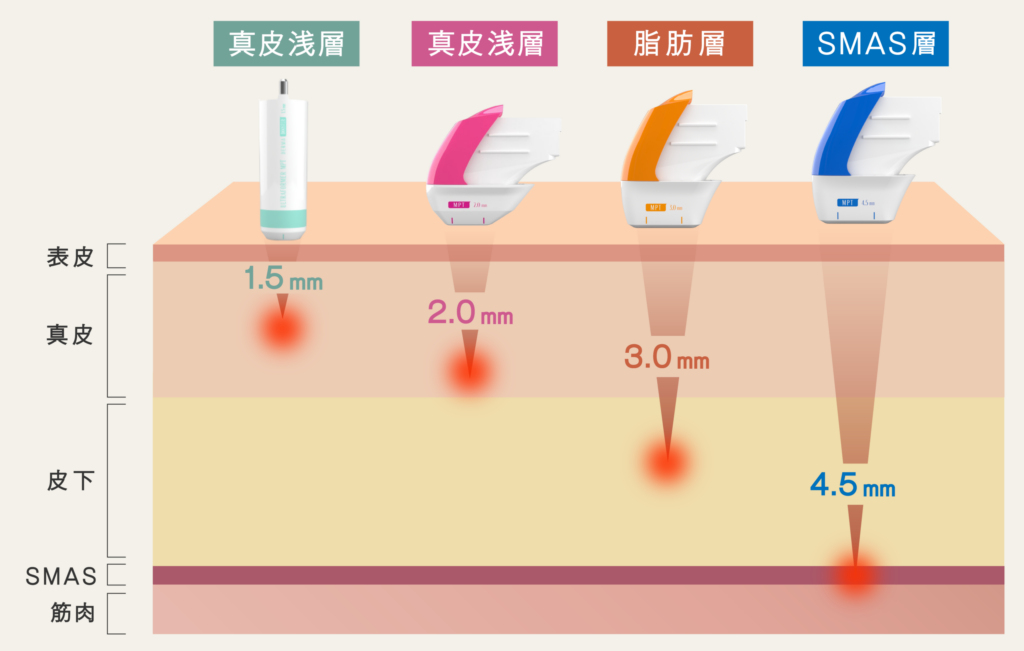 ウルトラフォーマーMPTは、カートリッジの種類を変えることで真皮層、皮膚組織、SMAS筋に選択的にアプローチが可能です。当院では、4種類のカートリッジ(1.0mm/2.0mm/3.0mm/4.5mm)で、超音波(ハイフ)を皮膚に照射し、皮膚組織内で熱凝固作用を起こし、コラーゲン生成および再生を促します。
