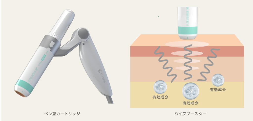 ウルトラフォーマーMPTでは、世界初となるペン型のハイフアタッチメントが搭載されています。従来の線状照射に加え、円を描くように照射できるサークル照射が可能になり、真皮層へ高密度にエネルギーを届けることができます。さらに、美白・美肌成分を含む専用ジェルを使用した超音波導入(ハイフブースター®︎)にも対応しており、リフトアップや引き締めに加えて、美白や肌質改善といった美肌効果も同時に期待できます。