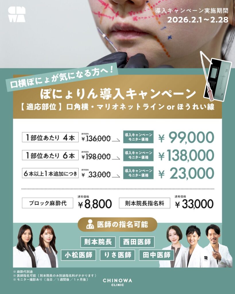 ぽにょりんは、短く特殊な形状の糸を使用し、強く引き上げるのではなく、口まわりやマリオネットラインの段差・たるみをなめらかに整える治療です。従来の糸リフトよりもナチュラルな仕上がりとダウンタイムの短さが特徴で、「糸を入れるのは不安」「やりすぎた印象になりたくない」という方にもおすすめです。